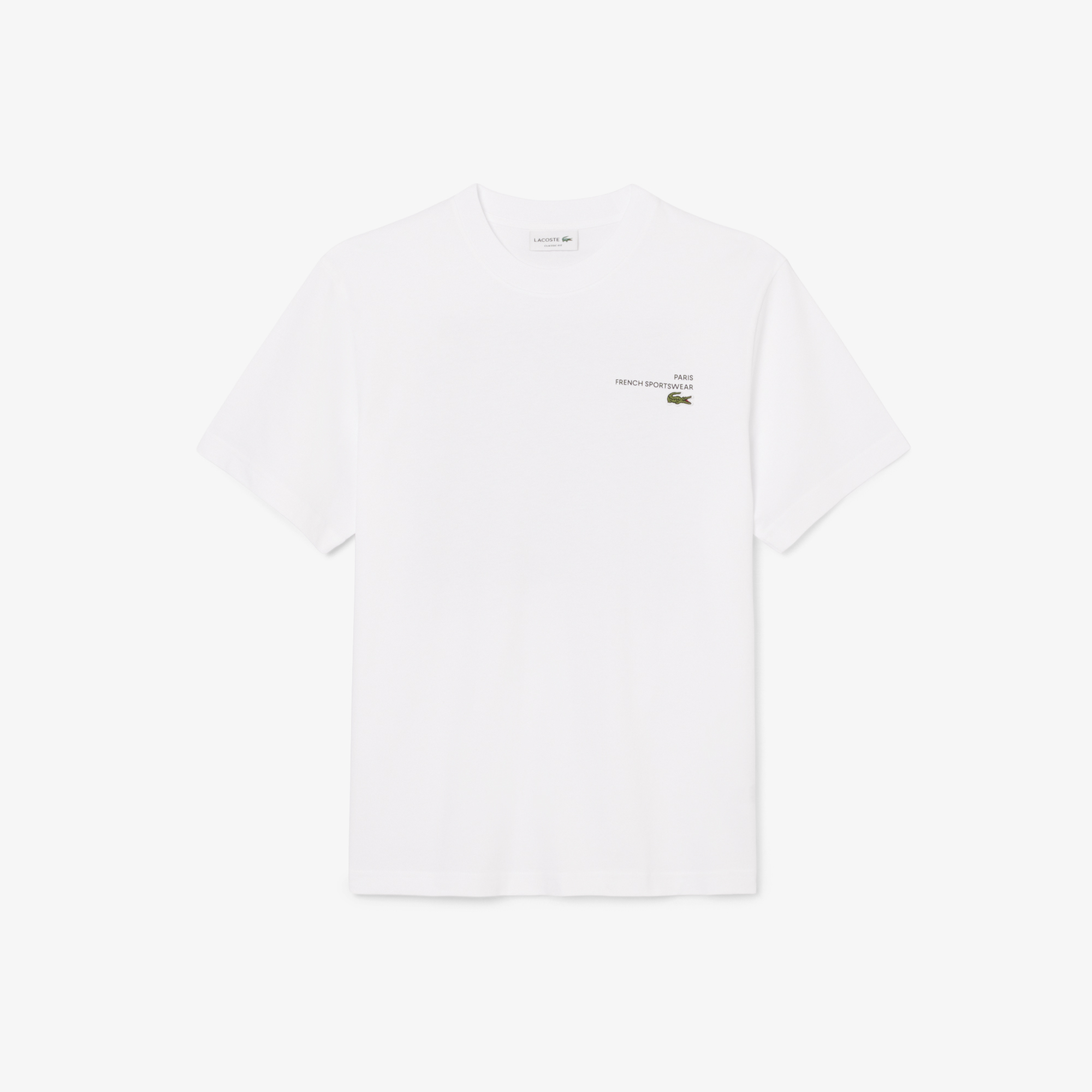 Футболка из хлопка с принтом \ Хлопчатобумажный трикотаж \ Классический крой для естественной непринужденности \ Фирменный знак Lacoste на груди \ Крупный принт на спине с изображением толпы зрителей на теннисном турнире \ Пришитое лого на груди \ Матери