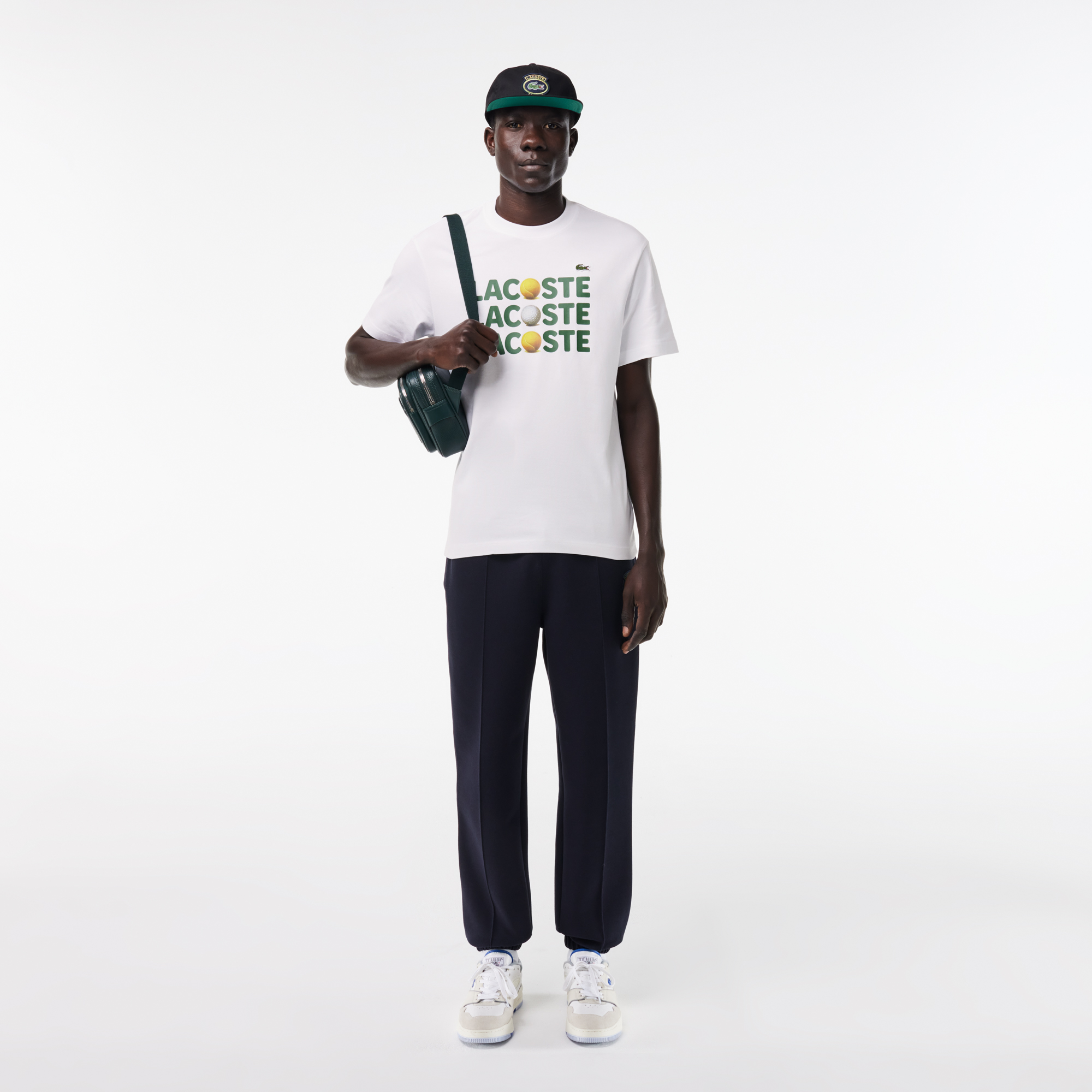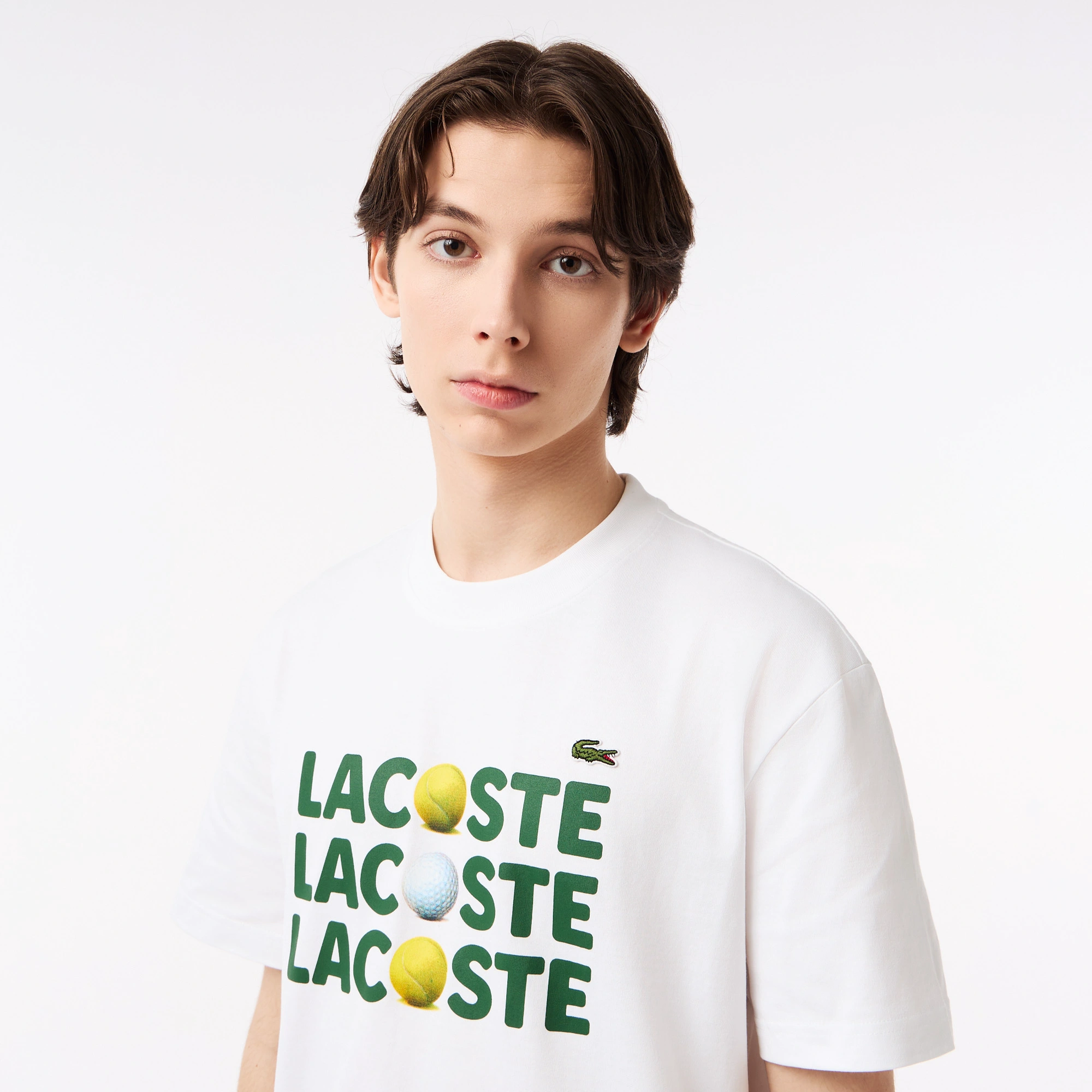 Футболка с плотным хлопковым принтом \ Органический хлопок \ Классическая, удобная посадка, заниженные плечи \ Круглый вырез \ Контрастный принт \ Логотип из силикона на груди \ Естественная легкость \ Брендинг Lacoste и крокодиловый принт \ Хлопковый