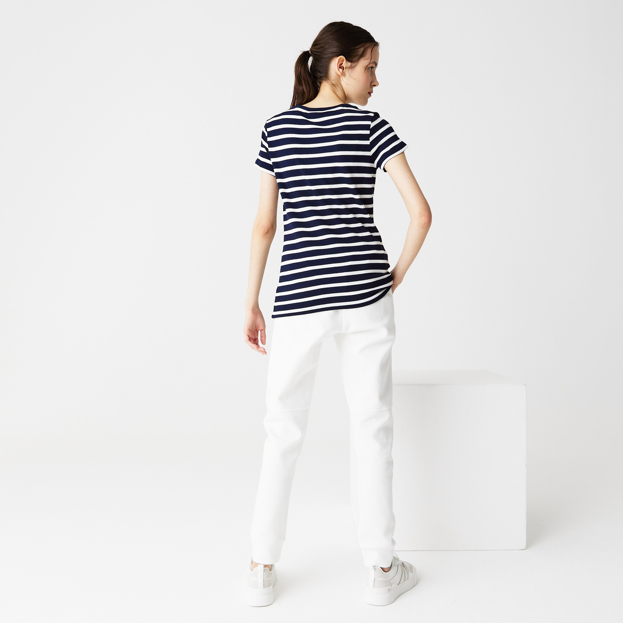 Круглый вырез\Короткие рукава\В полоску\Логотип в тон изделия на груди\Материал: 96% вискоза 4% эластан\Рост модели 183 см, размер одежды 36