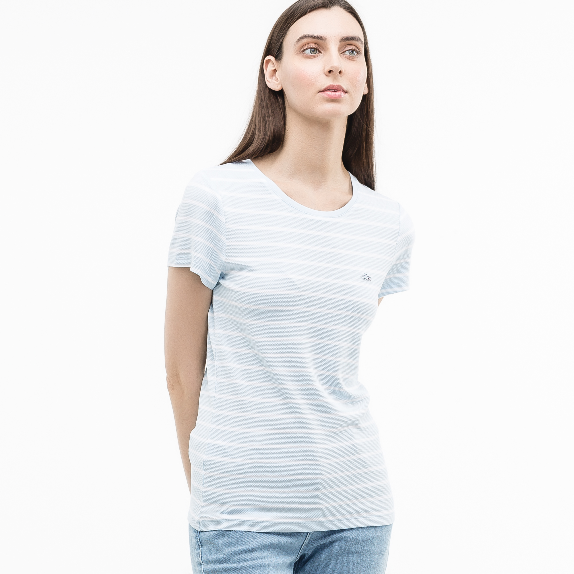 Круглый вырез\Короткие рукава\В полоску\Логотип в тон изделия на груди\Материал: 96% вискоза 4% эластан\Рост модели 183 см, размер одежды 36