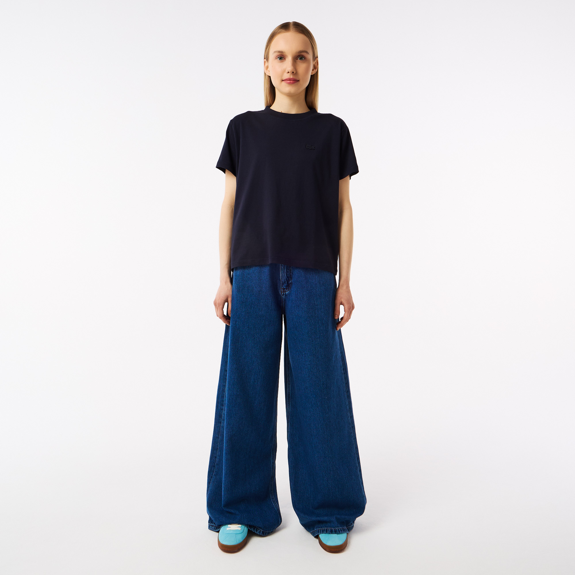Круглый вырез\Короткие рукава\Спущенная линия плеч\Логотип в тон изделия на груди\Материал: 66% хлопок 34% полиэстер\Рост модели 174 см, размер одежды 36