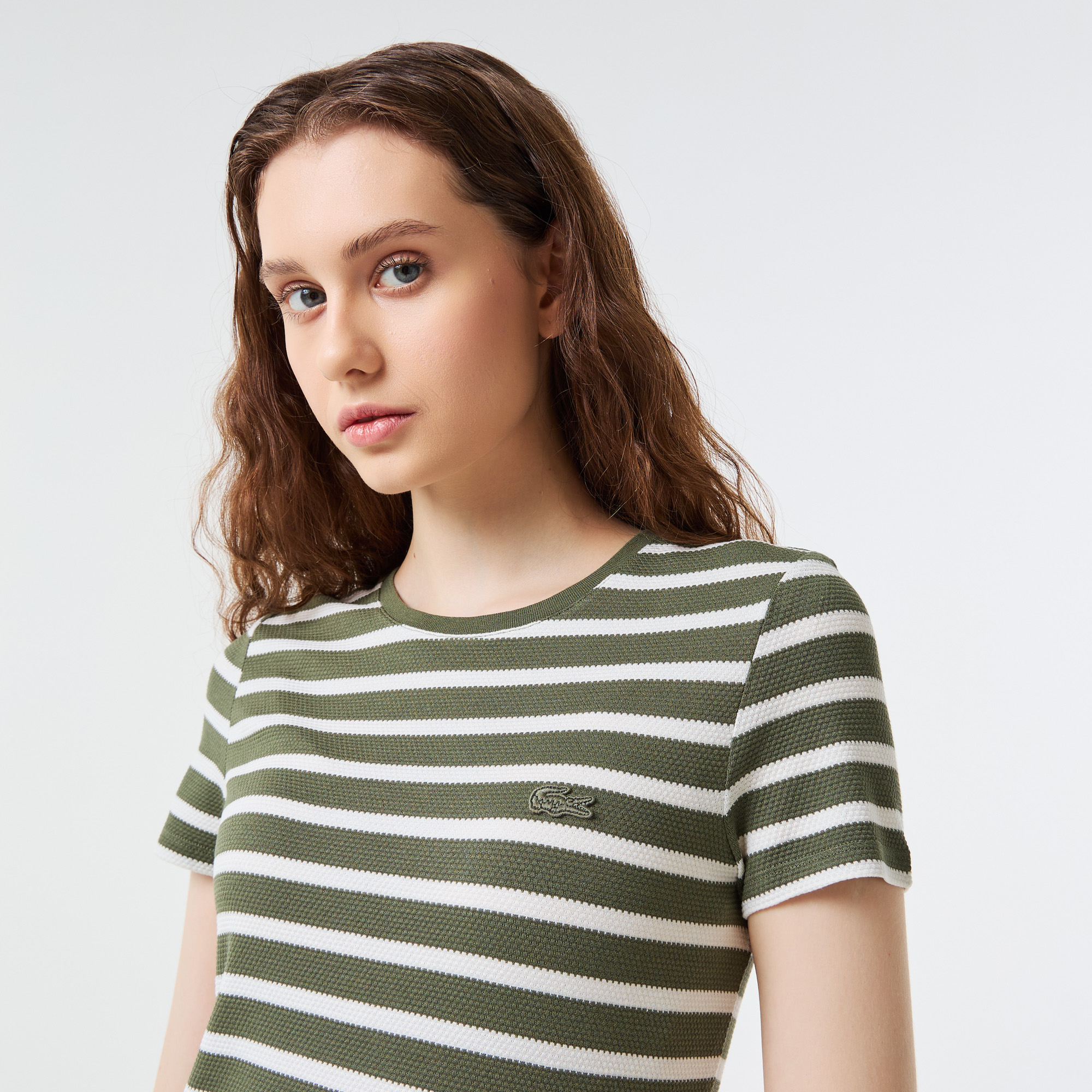 Круглый вырез\Короткие рукава\В полоску\Логотип в тон изделия на груди\Материал: 96% вискоза 4% эластан\Рост модели 183 см, размер одежды 36