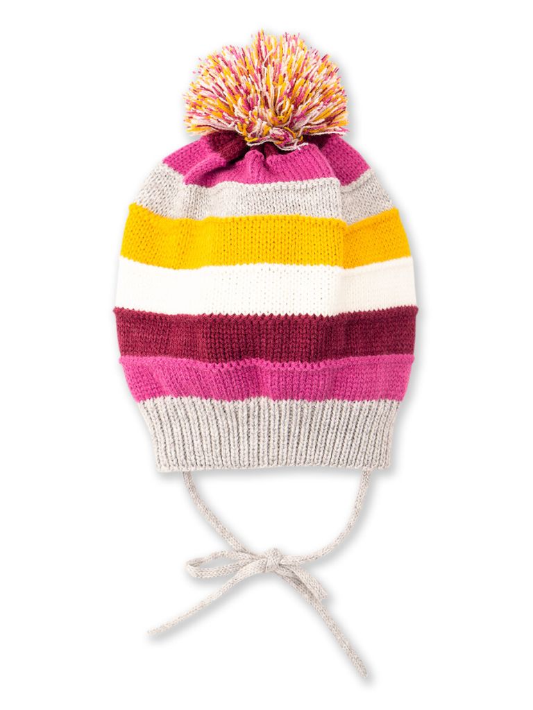 Вязанная шапка с помпоном из ниток на завязках. Модель с отворотом декорирована разноцветными полосками. Внутри этикетка с именем.
