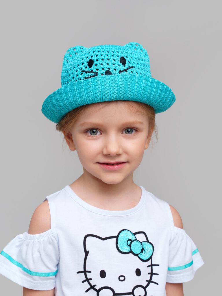 Шляпа детская для девочки. Дизайн мордочка кошки. Внутренняя регулировка размера по обхвату головы за счет атласных ленточек.