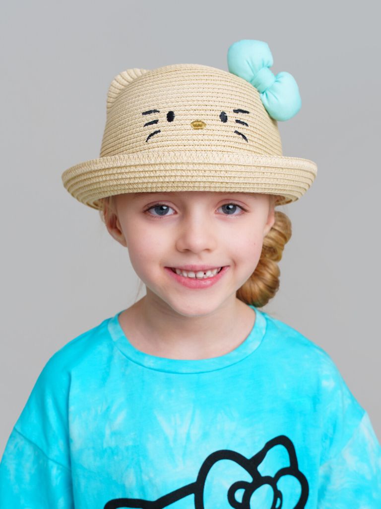 Шляпа детская для девочки. Шляпа соломенная. 100% натуральный материал бумажная соломка. Дизайн мордочка кошки. Декор-бантик сбоку из отделочной ленты.