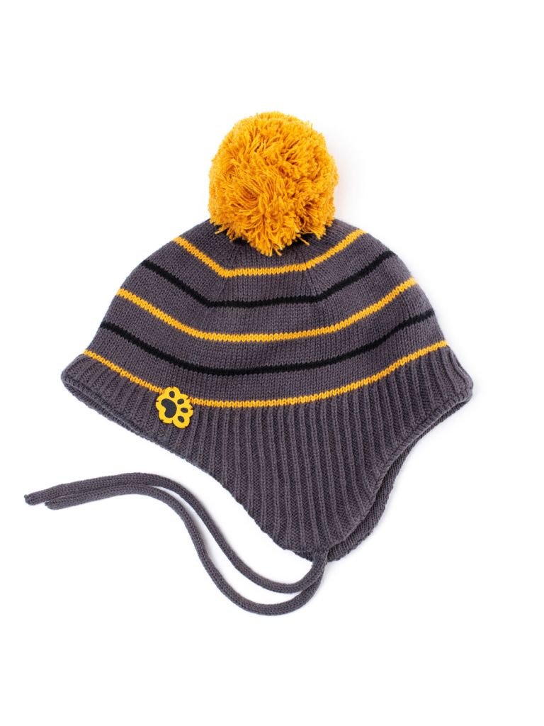 Трикотажная шапка для мальчиков с завязками и ярким помпоном. Модель декорирована принтом в полоску.