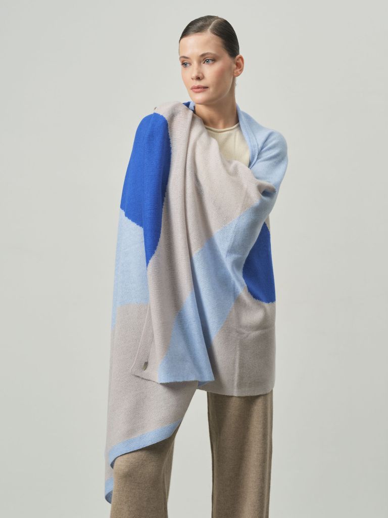 Элегантный палантин в современном геометрическом дизайне — выразительный акцент в гардеробе и универсальный элемент многослойных образов. Модель мягко струится по фигуре, создавая эффект свободного силуэта и визуальной лёгкости. Идеально подходит для прохладных дней, путешествий и стильных городских комплектов. Это изделие сочетает художественный принт и премиальное ощущение комфорта.Материал:Мягкий, приятный к телу трикотаж на основе натуральных волокон с добавлением деликатных смесовых нитей для сохранения формы. Полотно отличается лёгкостью, пластичностью и хорошей драпируемостью, обеспечивая тепло без утяжеления.Дизайн и детали:Свободный прямоугольный формат с плавно обработанными краями. Крупный абстрактный геометрический рисунок в контрастных оттенках создаёт динамичный и современный образ. Накидка красиво ложится по плечам, формируя мягкие складки и подчёркивая силуэт.Цвет:Сочетание светло-бежевого, небесно-голубого и насыщенного синего оттенков. Гармоничная палитра делает изделие универсальным — оно легко комбинируется с нейтральной базой и добавляет выразительности образу.Комфорт и универсальность:Лёгкая, мягкая и приятная к коже. Можно носить как палантин, накидку, шарф или лёгкое пончо. Подходит для офиса, прогулок, путешествий и вечерних выходов. Универсальный размер позволяет красиво драпировать изделие разными способами.Уход:Рекомендуется деликатная ручная стирка или щадящий режим для шерсти при низкой температуре. Использовать мягкие средства без агрессивных компонентов. Сушить в горизонтальном положении вдали от прямых источников тепла и солнечных лучей.