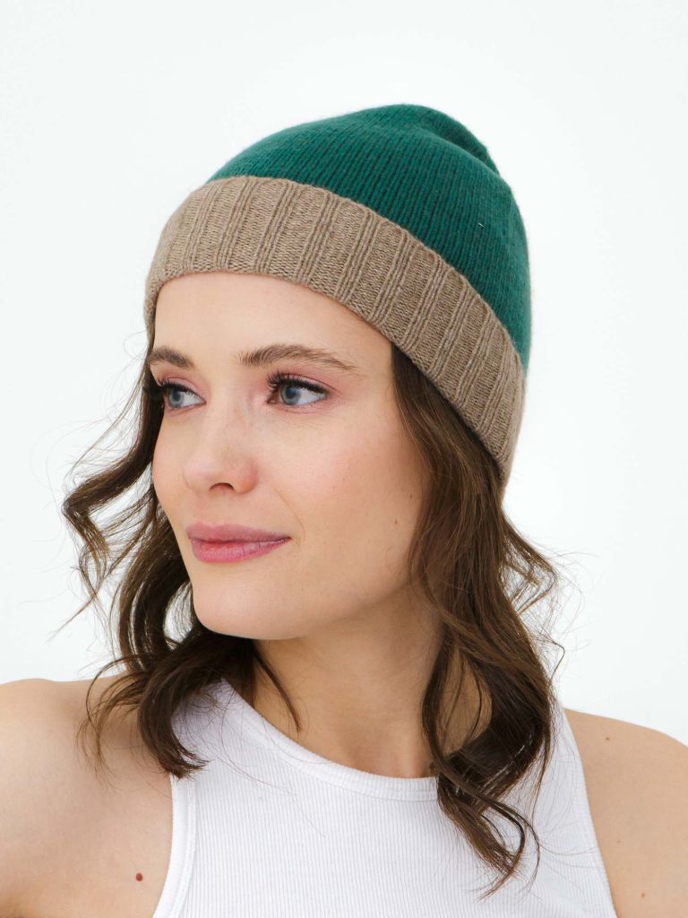 Элегантная двухцветная шапка из мягкого кашемира, сочетающая глубокий оттенок изумруда и теплый тон капучино. Лаконичный дизайн делает модель универсальной для повседневных и более собранных образов.