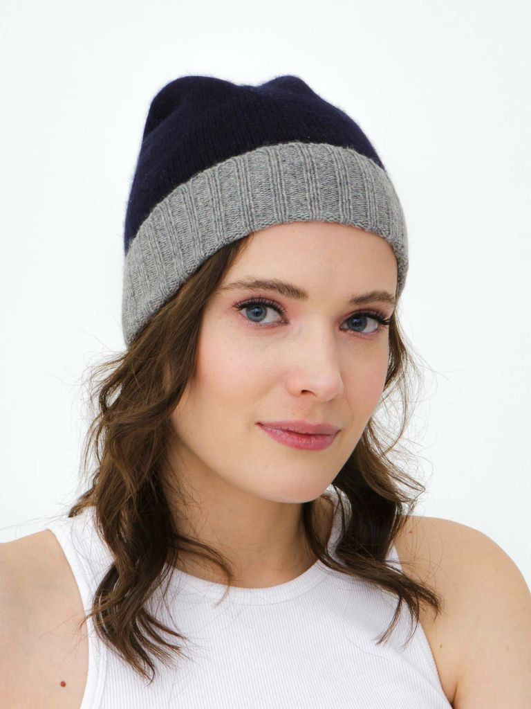Двухцветная кашемировая шапка с лаконичным дизайном, сочетающая темно-синий верх и серый отворот. Универсальная модель для повседневного гардероба в холодное время года.