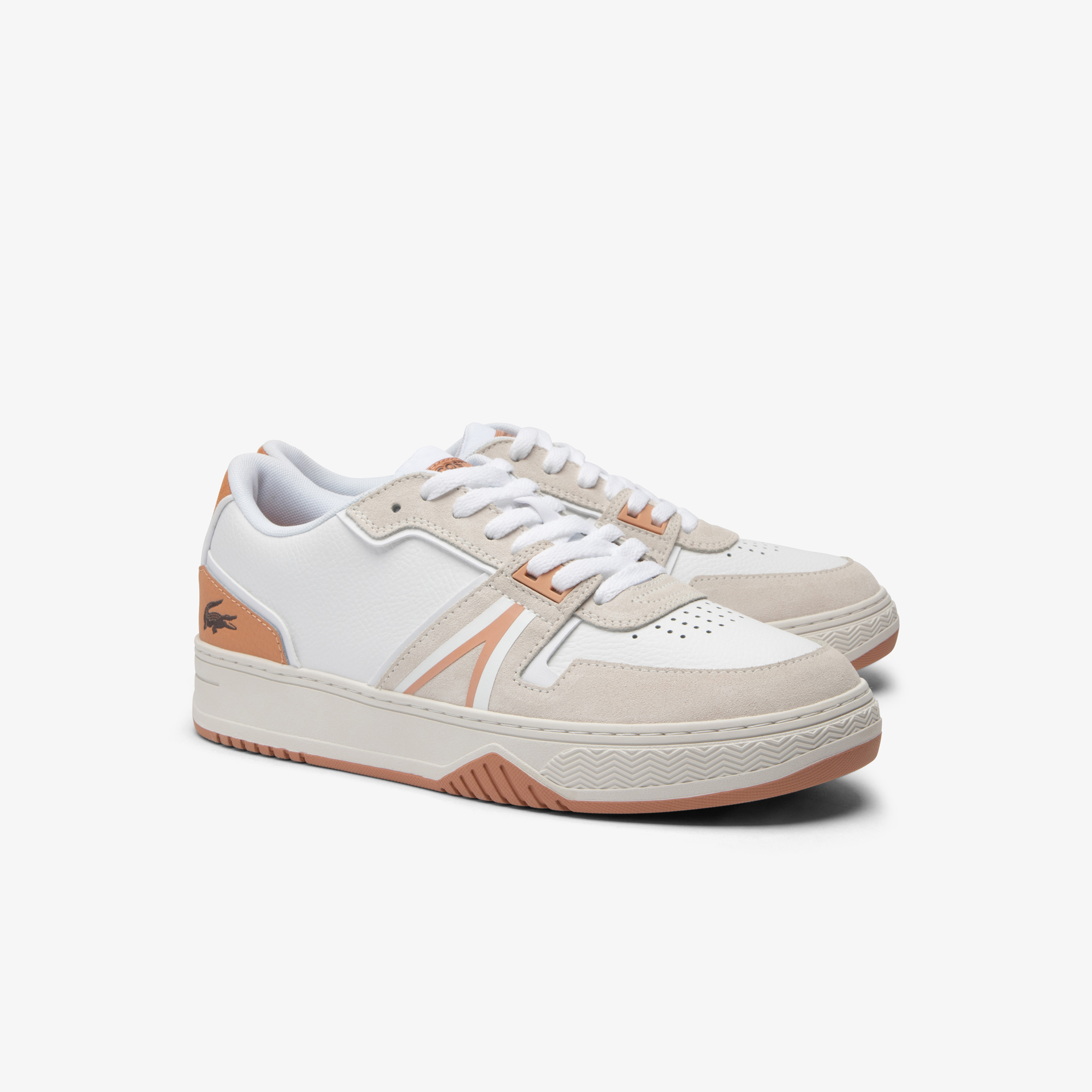 Кроссовки L001 - это современные кроссовки с классическим брендом Lacoste и спортивной эстетикой. Они являются частью коллекции Light Cognac design и имеют белоснежную основу с накладками из натуральной кожи и замшевой накладкой на носок, а также логотип