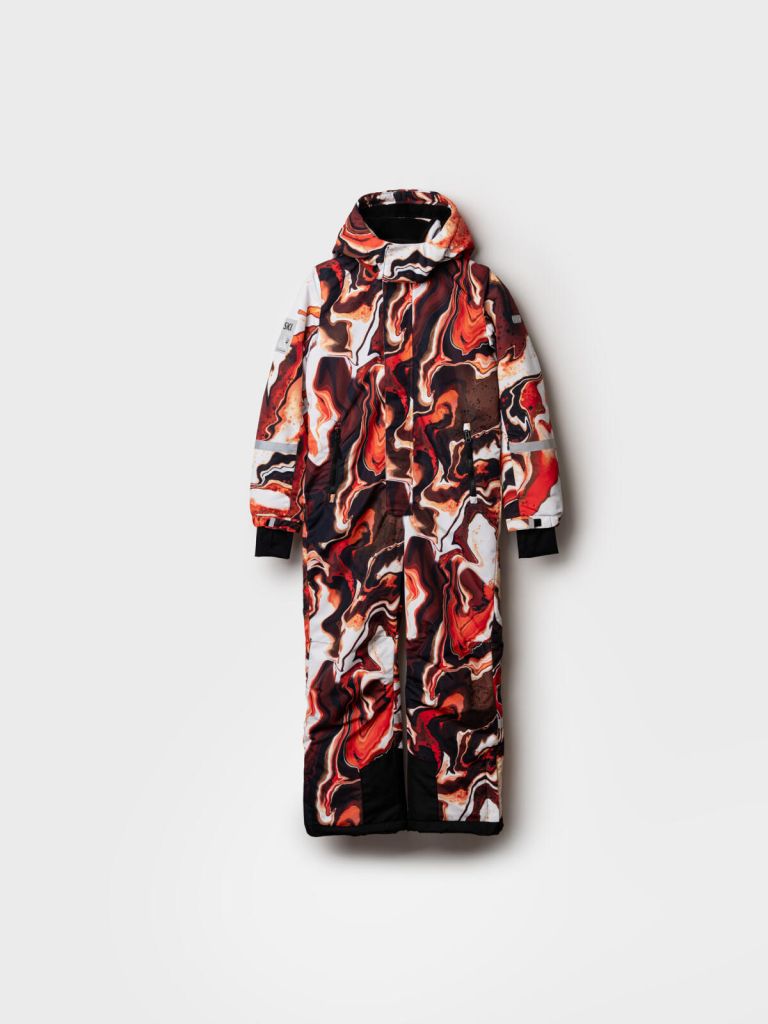 Комбинезон выполнен из прочных материалов с мембраной, что делает его водонепроницаемым и ветрозащитным, при этом позволяя коже дышать. Флисовая подкладка добавляет мягкости и тепла, обеспечивая комфорт в холодные дни. Съемный капюшон со стопперами легко регулируется и защищает голову от ветра и осадков.