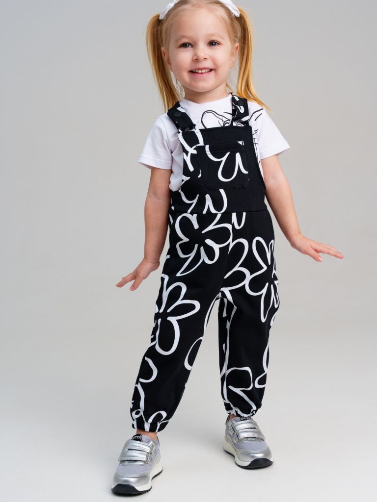 Детский комбинезон для девочки. Резюмируемые лямки. Застежка на пуговицы. Функциональные карманы. Манжеты на резинке. Модель выполнена из качественного и приятного на ощупь трикотажа.
