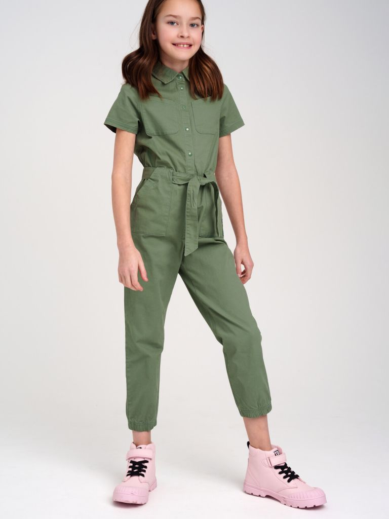Комбинезон с поясом из твила; высокое содержание хлопка 98%, а благодаря наличию эластана в составе ткани изделие проще в уходе и держит форму. Модель застегивается на кнопки.