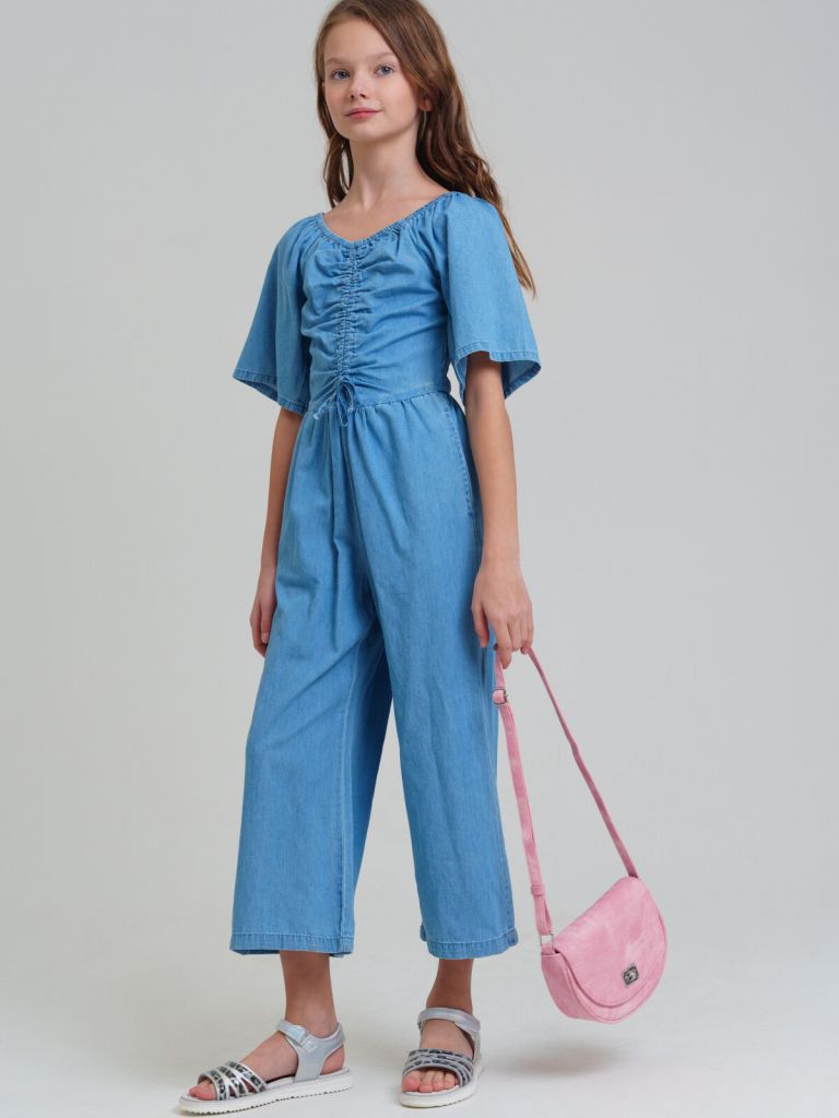 Джинсовый комбинезон для девочки подростка. Приталенный силуэт. 100% хлопок. Без застежек. Спинка с эластичной резинкой. Брюки - кюлоты.