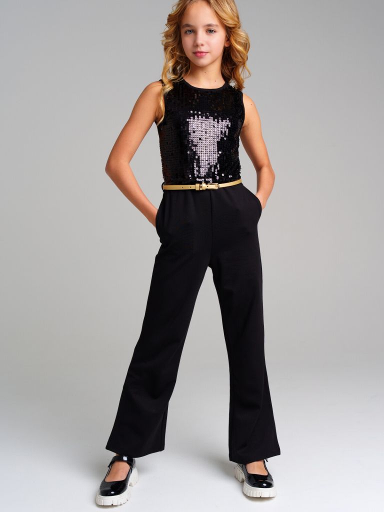 Комбинезон из плотного трикотажного полотна. Мягкий, эластичный материал, благодаря прочному плетению хорошо держит форму, не мнется, не растягивается. Свободный крой брючин. Застежка сзади на потайную молнию. Декор из сетки.