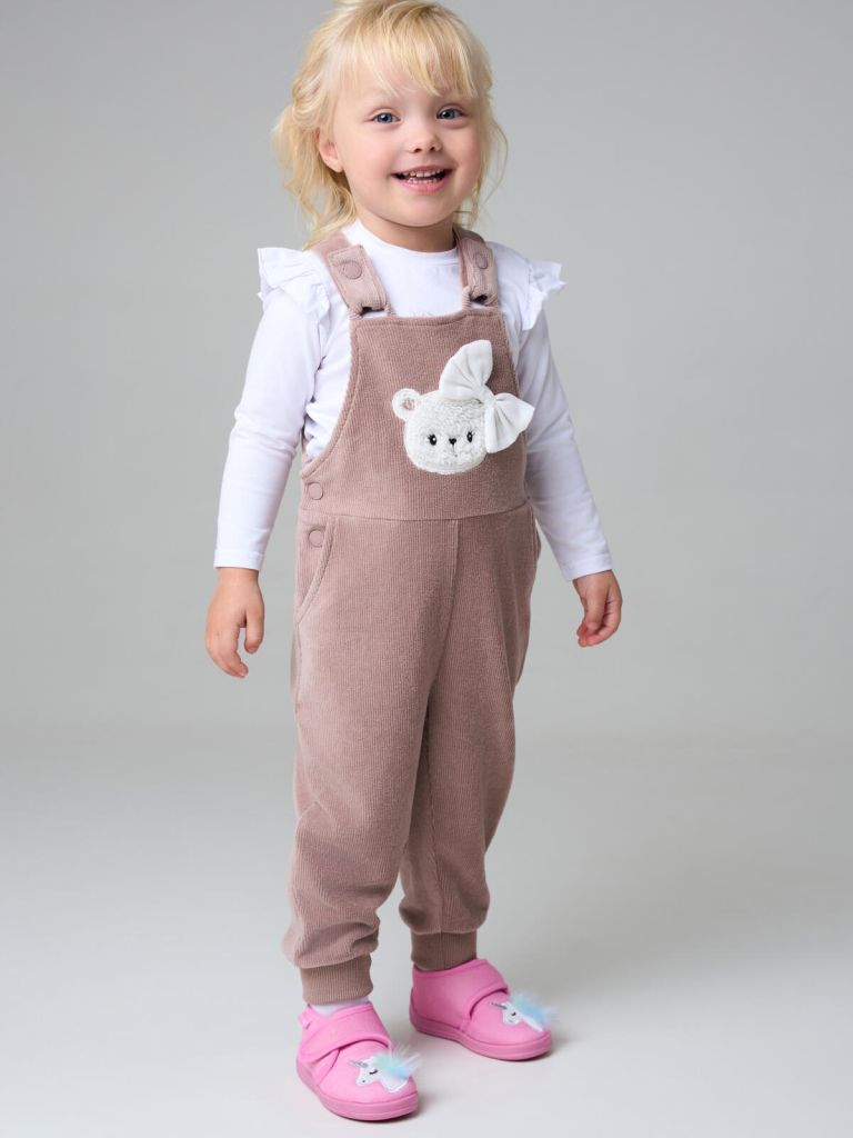 Полукомбинезон легко надевается благодаря кнопочной застёжке на плечах и между ножек. Приятный на ощупь материал позволяет коже дышать и сохраняет комфорт в течение дня. Аппликация делает образ более нарядным и привлекательным для девочек.