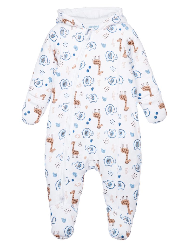 Комбинезон из натурального хлопка с утеплителем. Капюшон с легкой фиксацией на резинку. Удобная застежка на молнию. На рукавах митенки.
