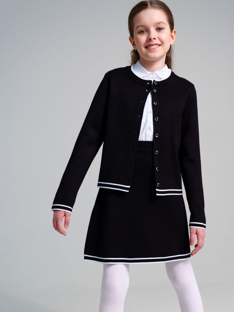 Школьный костюм для девочки подростка. Комплект для девочки подростка отлично подойдет в школу на каждый день и для торжественных мероприятий. Костюм выполнен из вязаного трикотажа с высоким содержанием вискозы, что обеспечивает максимальный комфорт для школьницы во время занятий. Кардиган, кофта прямого силуэта на пуговицах. Юбка трапециевидного силуэта с резинкой по талии.
