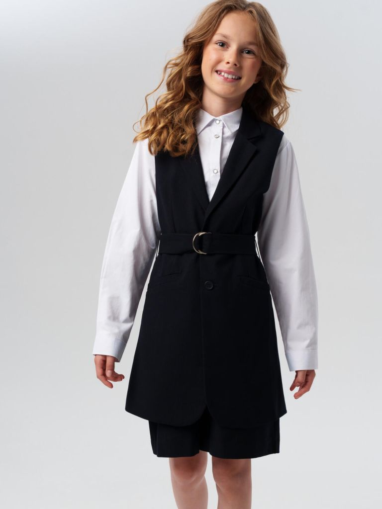 Этот синий подростковый костюм для девочки выполнен из мягкого, но плотного текстиля с добавлением вискозы — материал приятен на ощупь, хорошо дышит и комфортен в течение всего дня. Стильный школьный жилет на подкладке дополнен аккуратными прорезными карманами и съёмным поясом, который позволяет варьировать образ: от строгого до более расслабленного.