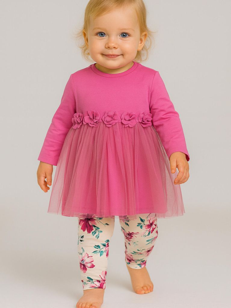 Модный розовый комплект для девочки с платьем из сетки и леггинсами от PlayToday — универсальный наряд для сада, праздников и стильных будней.