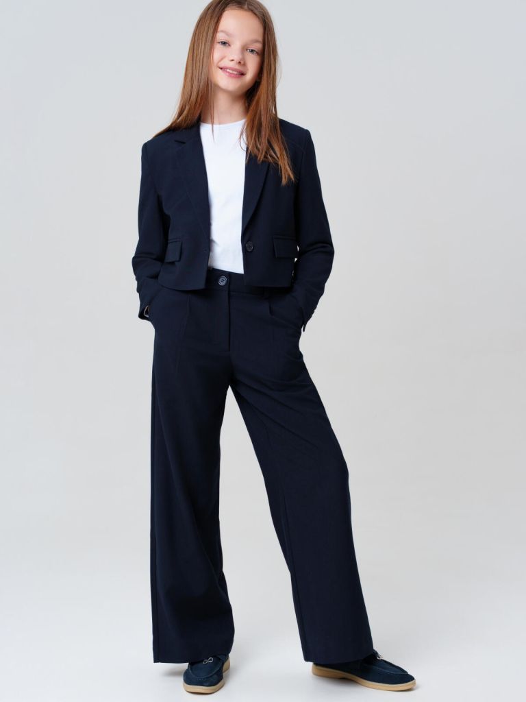 Классический школьный текстильный темно-синий костюм для девочки подростка от PlayToday — элегантное и удобное решение на каждый день. Этот стильный комплект с укороченным пиджаком и брюками-палаццо станет универсальной основой гардероба для школьных будней, праздников и особых случаев.