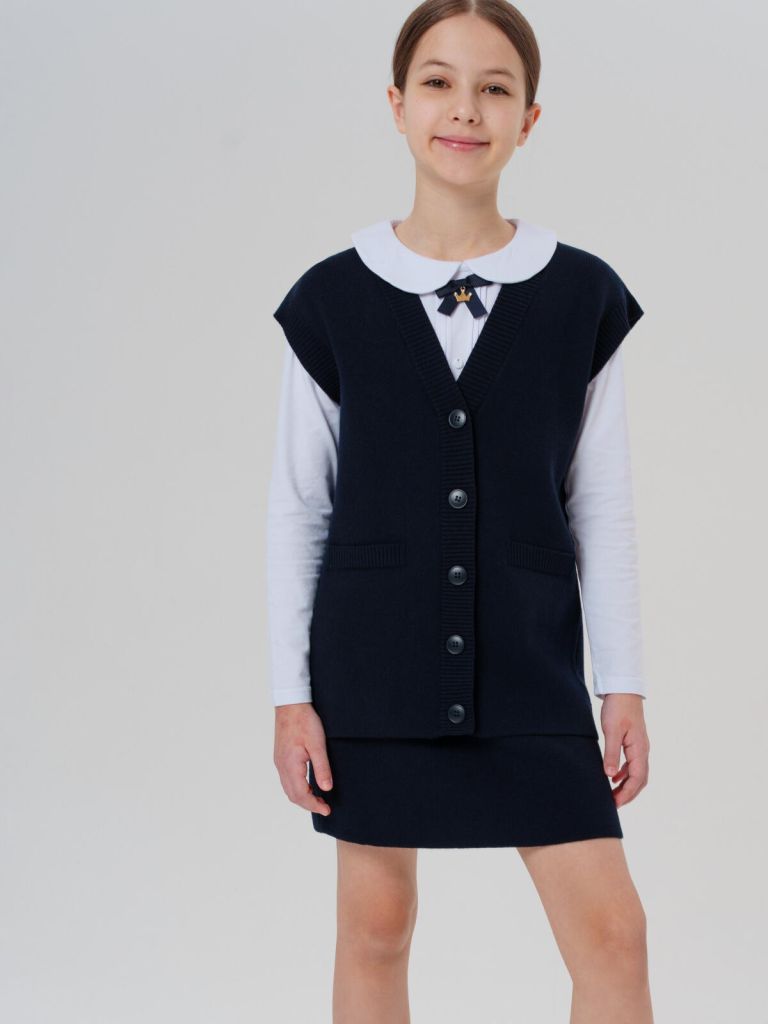Классический трикотажный школьный темно-синий костюм для девочки подростка от PlayToday — элегантный и универсальный комплект, который подойдёт как для повседневных школьных занятий, так и для торжественных событий. Стильный жилет в паре с удобной юбкой создают гармоничный образ, в котором комфортно учиться, двигаться и чувствовать себя уверенно весь день.
