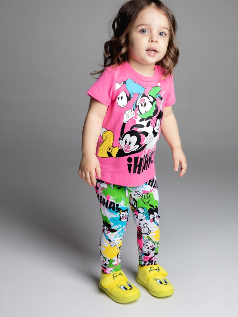 Комплект: футболка и легинсы из качественного и приятного на ощупь трикотажа джерси. Высокое содержание хлопка. Благодаря наличию эластана в составе ткани изделие проще в уходе и держит форму. Кнопки на плечах.