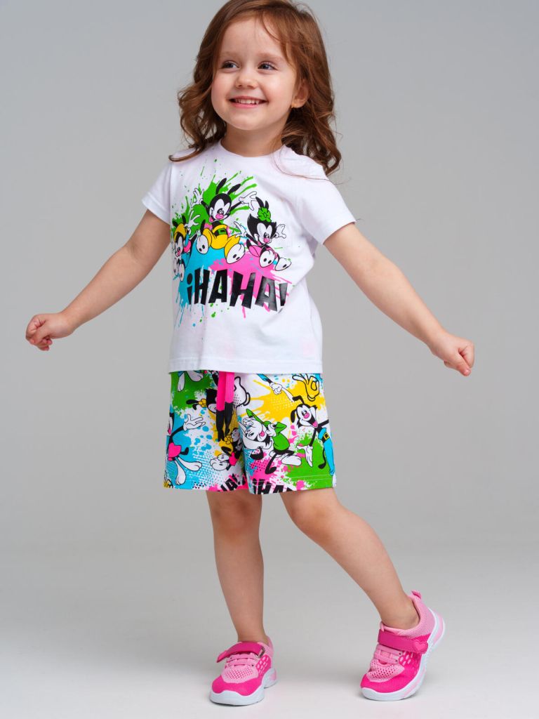 Комплект: футболка, шорты из качественного и приятного на ощупь трикотажа джерси. Высокое содержание хлопка 95%. Благодаря наличию эластана в составе ткани изделие проще в уходе и держит форму. На плече застежка на кнопки. Эластичный пояс со шнурком.
