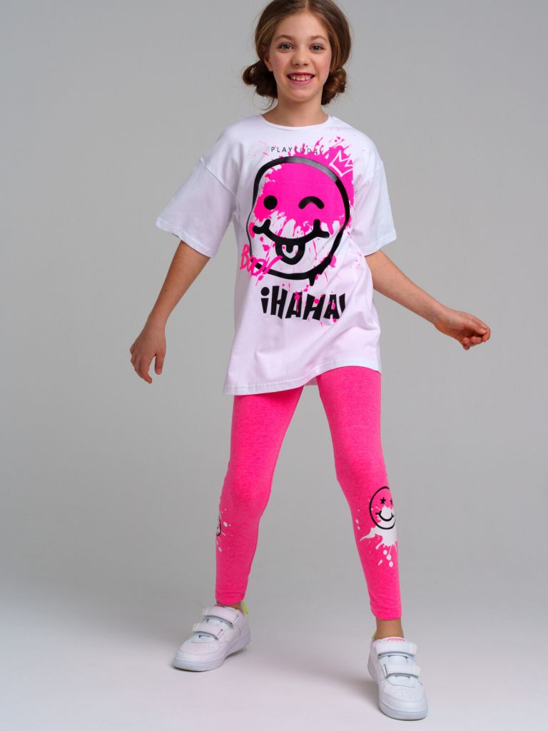 Комплект: футболка oversize, легинсы из качественного и приятного на ощупь трикотажа джерси. Высокое содержание хлопка 95%. Благодаря наличию эластана в составе ткани изделие проще в уходе и держит форму. Эластичный пояс.