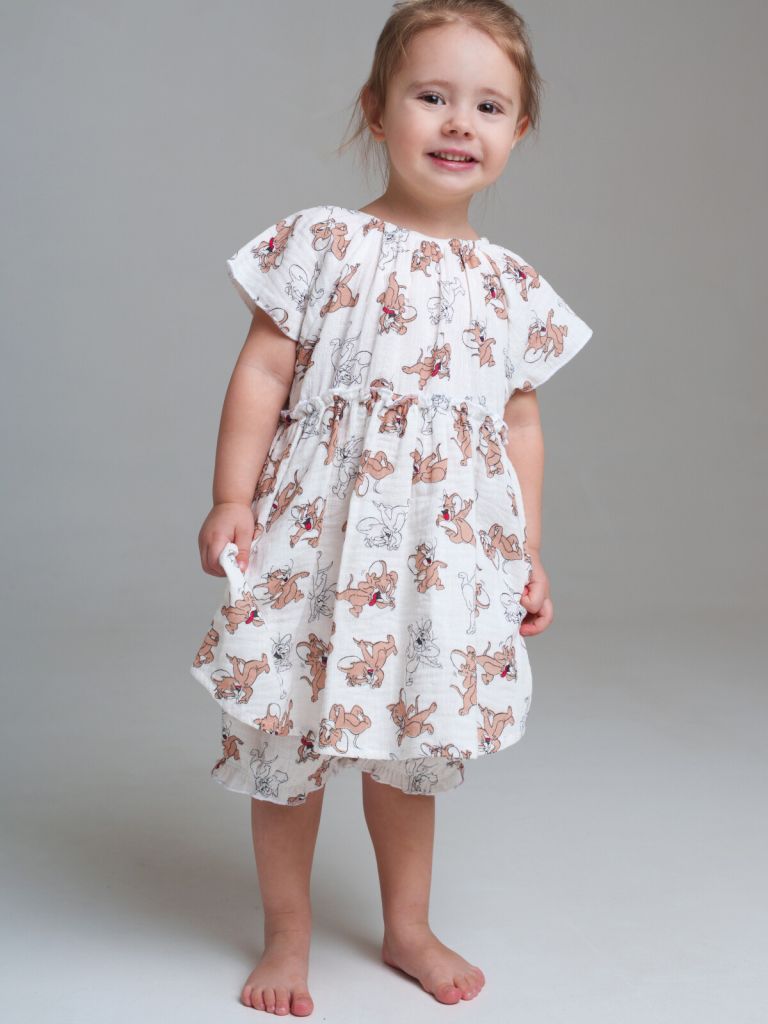 Костюм детский для девочки. Комплект: платье, шорты из муслина. Резинка по талии. Шорты на резинке. Модель выполнена из качественного и плотного текстиля.