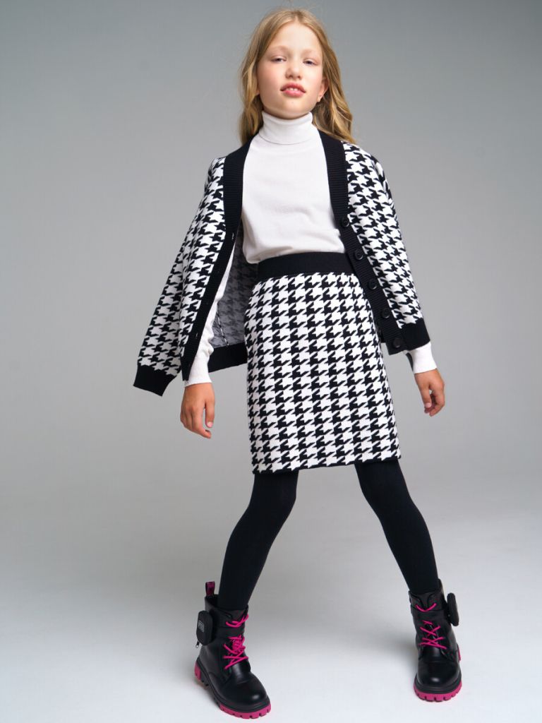 Школьный костюм для девочки подростка с модным рисунком "гусиная лапка". Комплект для девочки подростка отлично подойдет в школу на каждый день и для торжественных мероприятий. Костюм выполнен из вязаного трикотажа с высоким содержанием вискозы, что обеспечивает максимальный комфорт для школьницы во время занятий. Кардиган, кофта оверсайз на пуговицах. Юбка школьная прямого силуэта с резинкой по талии.