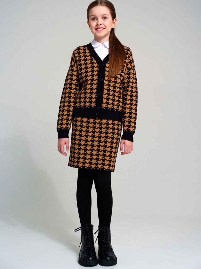 Школьный костюм для девочки подростка с модным рисунком "гусиная лапка". Комплект для девочки подростка отлично подойдет в школу на каждый день и для торжественных мероприятий. Костюм выполнен из вязаного трикотажа с высоким содержанием вискозы, что обеспечивает максимальный комфорт для школьницы во время занятий. Кардиган, кофта оверсайз на пуговицах. Юбка прямого силуэта с резинкой по талии.