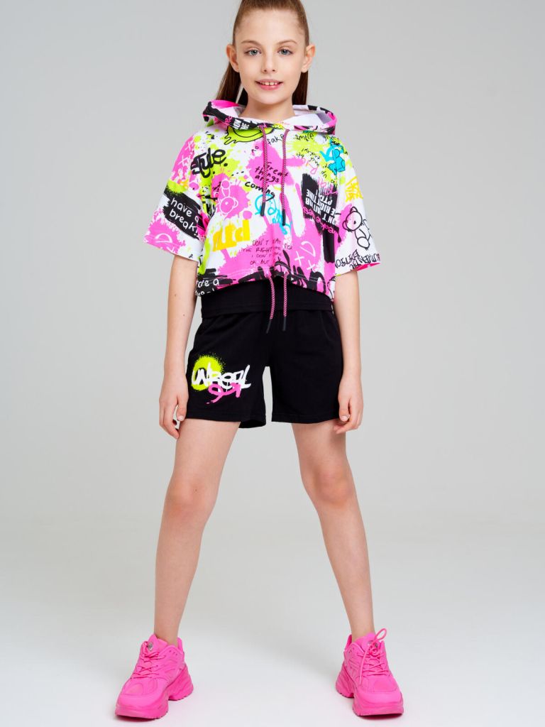 Костюм для девочки подростка. Майка, шорты, футболка из эластичного и приятного на ощупь трикотажа джерси. Капюшон и низ футболки с утяжкой шнурком. Шорты на резинке со шнурком. Функциональные боковые карманы. Высокое содержание хлопка 95%. Благодаря наличию эластана в составе ткани изделие держит форму и меньше мнется. Модель выполнена из качественного и приятного на ощупь трикотажа.