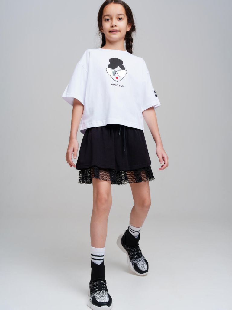 Костюм для девочки подростка.Футболка и юбка-шорты классической посадки. Костюм из качественного и приятного на ощупь трикотажа джерси с высоким содержанием хлопка 95%. Благодаря наличию эластана в составе ткани изделие проще в уходе и держит форму. Юбка шорты на резинке. Декор из сетки. Модель выполнена из качественного и приятного на ощупь трикотажа.