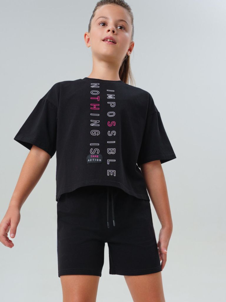 Этот спортивный подростковый комплект для девочек выполнен из мягкого и дышащего трикотажа с высоким содержанием хлопка. Материал приятный на ощупь, не вызывает раздражения и отлично подойдёт для уроков в зале и тренировок на свежем воздухе. Черная стильная футболка оверсайз для школы обеспечивает свободу движений и актуальный внешний вид, а удобные черные шорты с эластичным поясом для подростков сидят плотно, но не сдавливают.