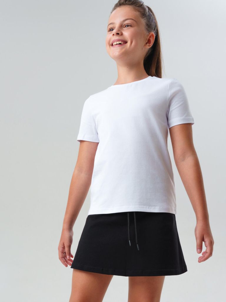 Свободная белая футболка с классическим кроем для школьницы не стесняет движений и хорошо сочетается с любой школьной одеждой. Классическая физкультурная юбка-шорты на эластичной резинке для спорта обеспечивает идеальную посадку без давления — девочке будет удобно на уроках физкультуры, прогулках и в игровой активности.