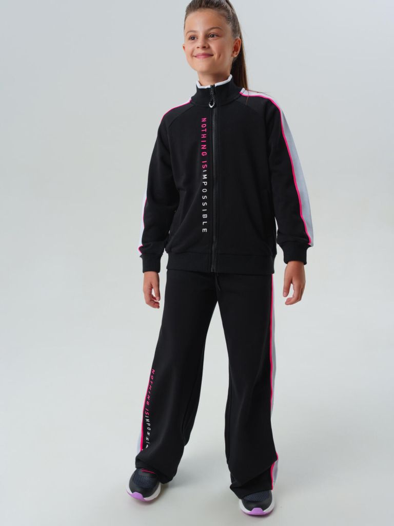 Удобная черная толстовка для подростков на молнии легко надевается и позволяет регулировать температуру в зависимости от погоды и активности. Классические физкультурные брюки джоггеры на мягкой резинке для школьницы не сковывают движения и отлично сидят на фигуре подростка. Карманы и у кофты, и у брюк делают комплект ещё более практичным.