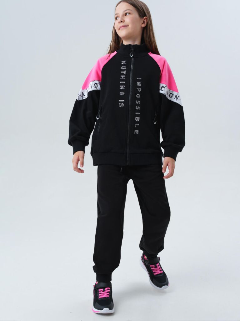 Этот черный спортивный подростковый костюм для девочек выполнен из дышащего футера без начёса — он сохраняет тепло в прохладную погоду и остаётся комфортным в помещении. Свободная удобная толстовка на молнии для подростков легко надевается и снимается — ребёнку удобно адаптироваться к температуре в классе или на улице.