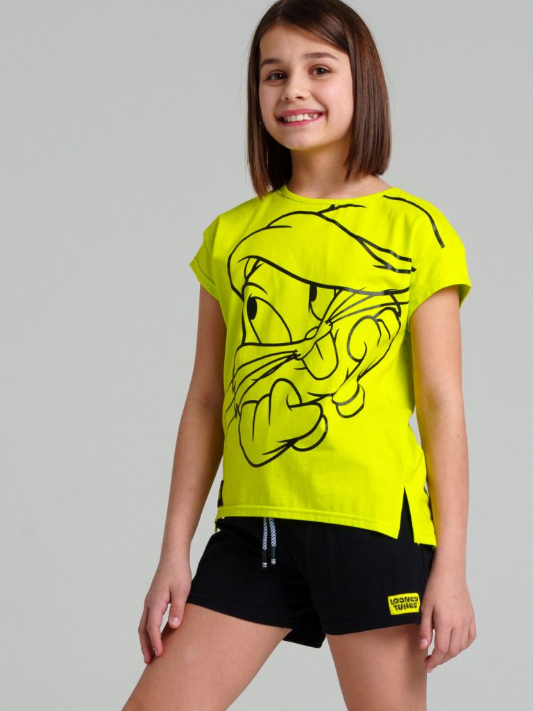 Комплект: футболка, шорты из качественного и приятного на ощупь трикотажа джерси. Высокое содержание хлопка 95%. Благодаря наличию эластана в составе ткани изделие проще в уходе и держит форму. Эластичный пояс со шнурком.