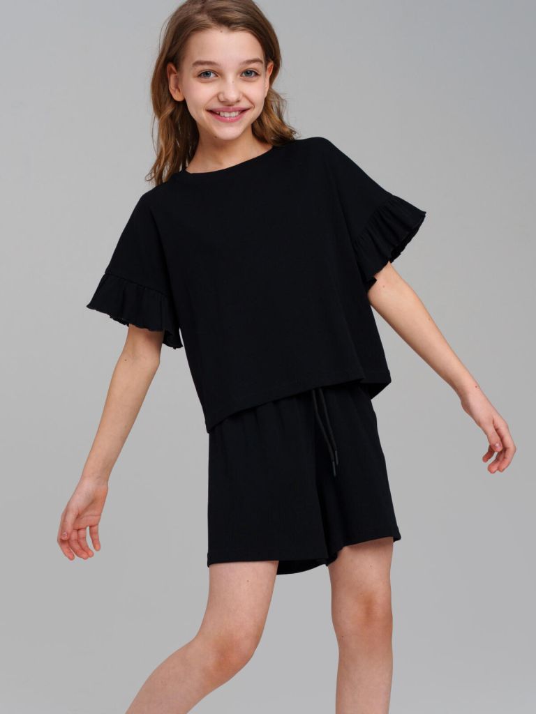 Костюм для девочки подростка. Футболка, шорты из приятного на ощупь трикотажа в эластичный рубчик. Шорты на резинке со шнурком. Высокое содержание хлопка. Модель выполнена из качественного и приятного на ощупь трикотажа.