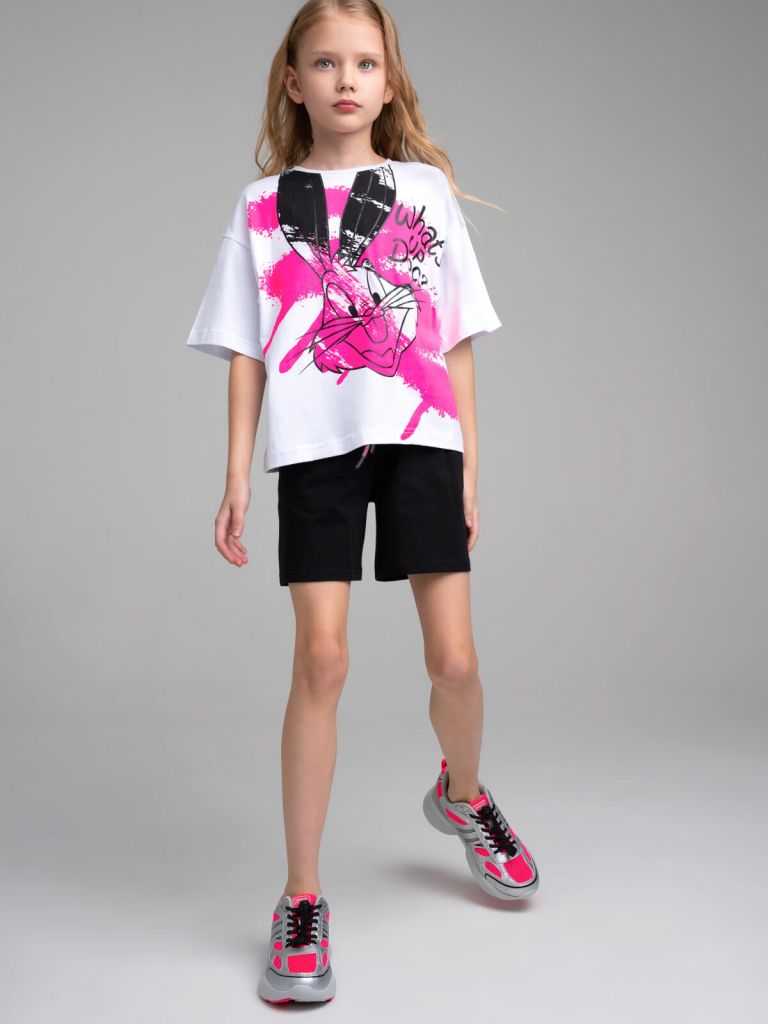 Костюм для девочки подростка. Футболка оверсайз, шорты из эластичного и приятного на ощупь трикотажа джерси. Шорты на резинке со шнурком. Функциональные боковые карманы. Высокое содержание хлопка 95%. Благодаря наличию эластана в составе ткани изделие держит форму и меньше мнется. Модель выполнена из качественного и приятного на ощупь трикотажа.