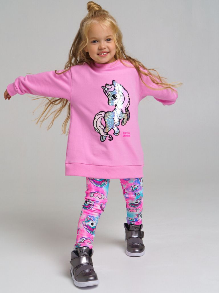 Комплект: свитшот удлиненный, легинсы. Размер изделия на фото - 110, параметры модели (см): рост 104,5, обхват груди-талии-бедер: 53,5-57-53,5. Трикотаж с начесом. Манжеты в рубчик.