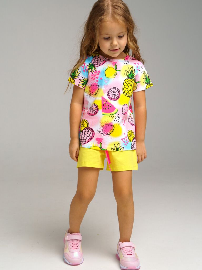 Комплект трикотажный: футболка, шорты. Высокое содержание хлопка 95%. Благодаря наличию эластана в составе ткани изделие проще в уходе и держит форму. Принт сохраняет первоначальный вид даже после многочисленных стирок. Оптимальная посадка: шорты не сползают при движении. Эластичный пояс со шнурком.