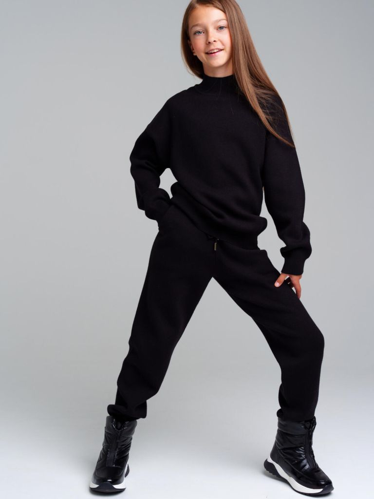 Комплект: джемпер и брюки из вязаного трикотажа. 50% вискоза. Вискоза отличается высокой гигроскопичностью - она впитывает влагу и отлично сохраняет тепло. Горловина, манжеты и низ изделия в рубчик. Брюки с эластичным поясом на шнурке. Карманы в боковых швах.