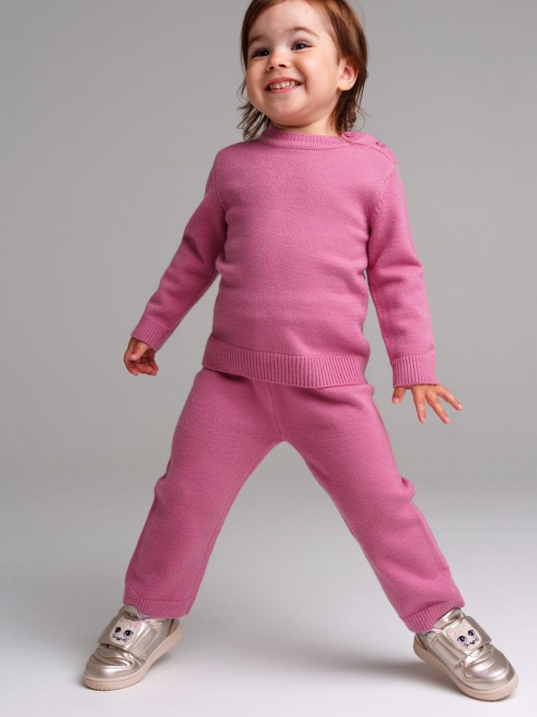 Комплект: джемпер и брюки из вязаного трикотажа. 50% вискоза. Вискоза отличается высокой гигроскопичностью - она впитывает влагу и отлично сохраняет тепло. Горловина, манжеты и низ изделия в рубчик.