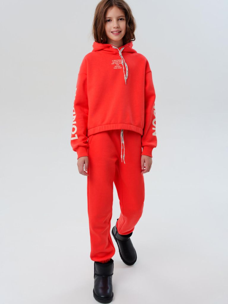 Спортивный костюм из футера с начесом для девочки подростка от PlayToday — стильный комплект из мягкого трикотажа: худи с капюшоном и модным принтом по рукавам + брюки на резинке со шнурком. Универсальный костюм в спортивно-уличном стиле подойдёт для активных будней, школы и отдыха.