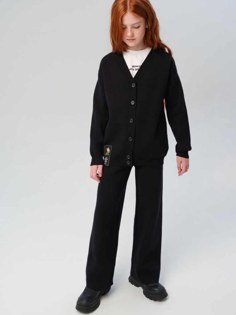 Вязаный костюм для девочки подростка от PlayToday — элегантное и практичное решение для школы, прогулок и повседневной жизни. В комплект входят прямые брюки палаццо и мягкий кардиган на пуговицах. Модель выполнена из приятного к телу трикотажа с добавлением вискозы и нейлона: ткань эластичная, не колется, хорошо держит форму и легко стирается.