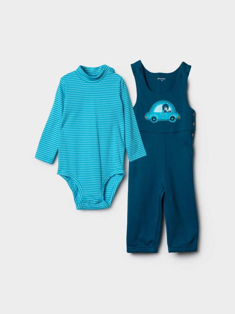 Модный бирюзовый комплект для мальчика с боди-водолазкой и полукомбинезоном от PlayToday — это практичная и стильная одежда для детского сада, прогулок и активного отдыха.