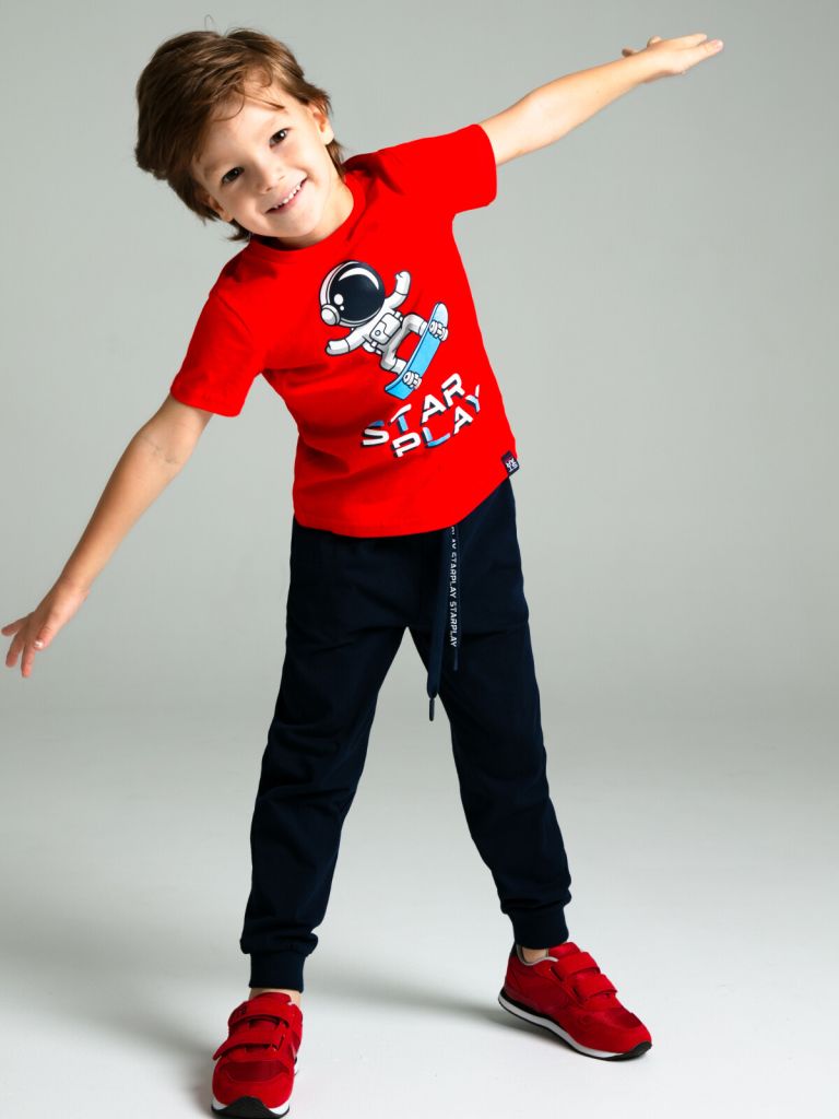 Комплект: футболка и брюки. Выполнен из эластичного и приятного на ощупь трикотажа. Брюки с карманами в боковых швах. Эластичный пояс со шнурком. Эластичные манжеты по низу брючин. Высокое содержание хлопка 95%. Благодаря наличию эластана в составе ткани изделие держит форму и меньше мнется.