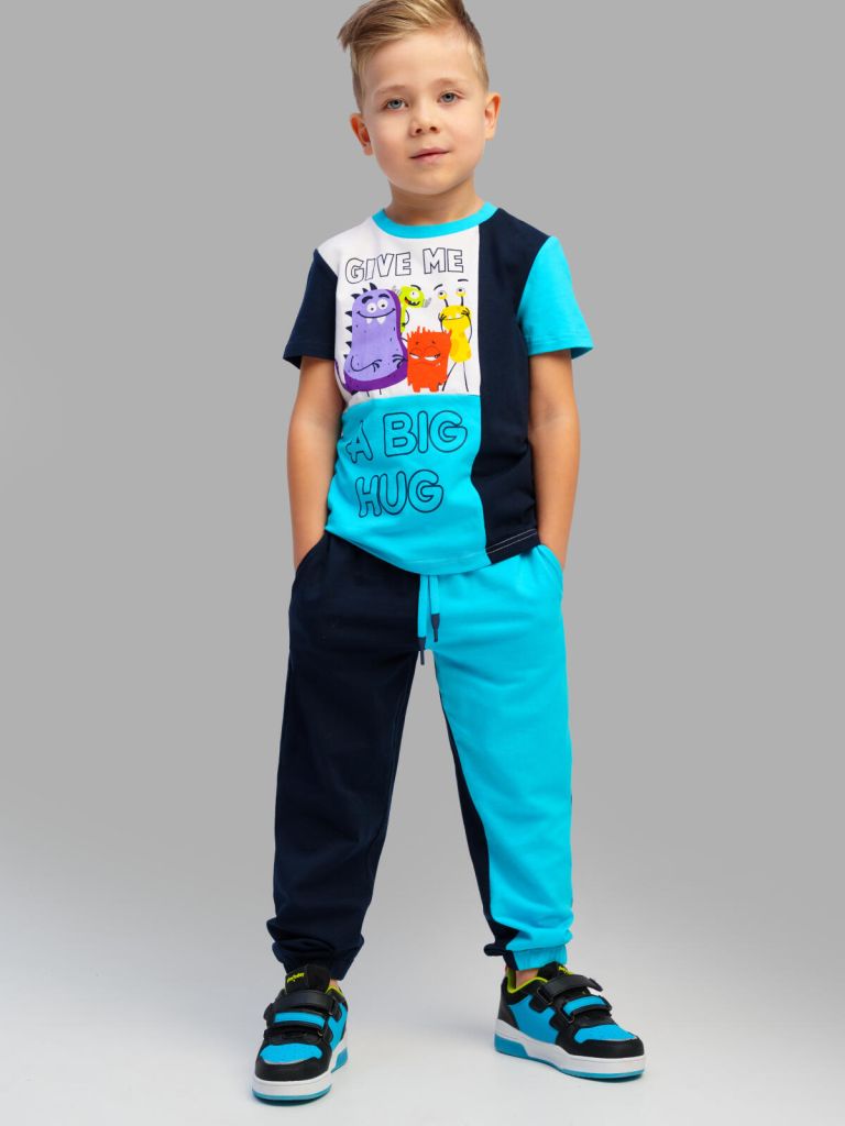 Костюм детский для мальчика. Комплект: футболка, шорты с высоким содержанием хлопка 95%. Благодаря наличию эластана в составе ткани изделие проще в уходе и держит форму. Штаны на резинке со шнурком. Боковые карманы.